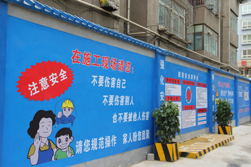 該項目現(xiàn)場較為狹小,場地及工作面都很緊張,但做到了國家及公司對標(biāo)準(zhǔn)化文明施工現(xiàn)場的各項要求:3#綜合樓緊鄰的建工中街由一個跨度為10米的安全防護(hù)棚和一個4米的人行道防護(hù)棚組成防護(hù)體,對馬路上來往的車輛、行人及商鋪經(jīng)營者和辦公區(qū)工作人員進(jìn)行有效的保護(hù)。進(jìn)入施工現(xiàn)場,映入眼簾的是一道整齊、規(guī)范的安全警示宣傳文化墻,包含整容鏡、公示欄、宣傳欄、安全講評臺、總平面布置圖、消防臺等內(nèi)容;正對大門的茶水亭、吸煙室也較為醒目;現(xiàn)場共分為鋼筋加工區(qū)、木工區(qū)、周轉(zhuǎn)料堆放區(qū)、辦公區(qū)和主體建筑物等五塊,功能分區(qū)明顯,標(biāo)示標(biāo)牌懸掛到位,安全警示標(biāo)志隨處可見。施工建筑主體內(nèi)干凈衛(wèi)生,臨邊及樓梯防護(hù)搭設(shè)標(biāo)準(zhǔn)、規(guī)范,電梯井防護(hù)采用了定型化防護(hù)門,各預(yù)留洞口均進(jìn)行了隔層或?qū)訉臃忾]。