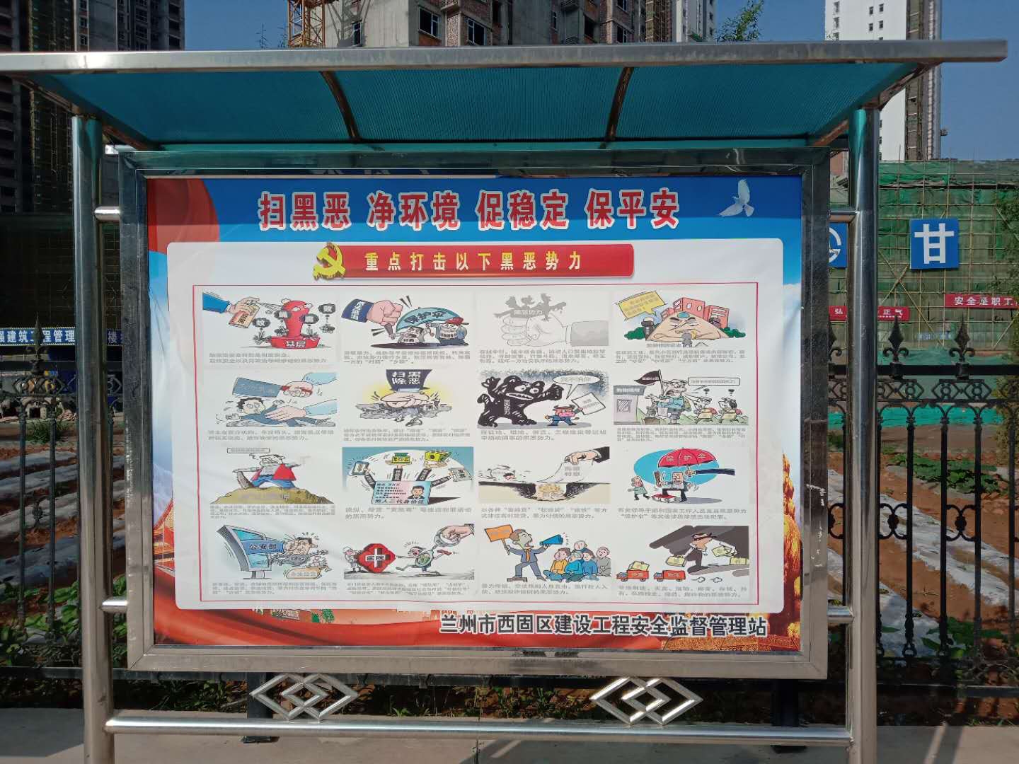 項目部也在工地現場設置展板、宣傳標語,向項目部全體職工宣傳“掃黑除惡”的相關知識,進一步增強了項目部全員參與嚴打黑惡罪犯,弘揚社會正氣,營造和諧氛圍,共建平安工地的意識。
